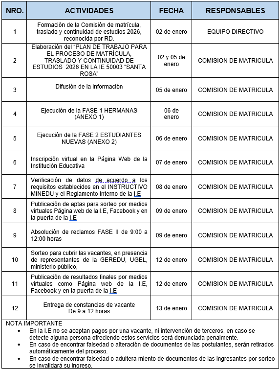 El sorteo virtual para cubrir las plazas de la admisión inicial 2026; se llevará acabo el día lunes 12 de enero del 2026 a horas 10:30 a.m. según lo establecido en el cronograma y el enlace de acceso se publicará minutos antes de empezar el sorteo; a través de este medio.